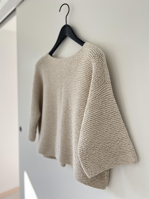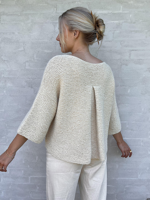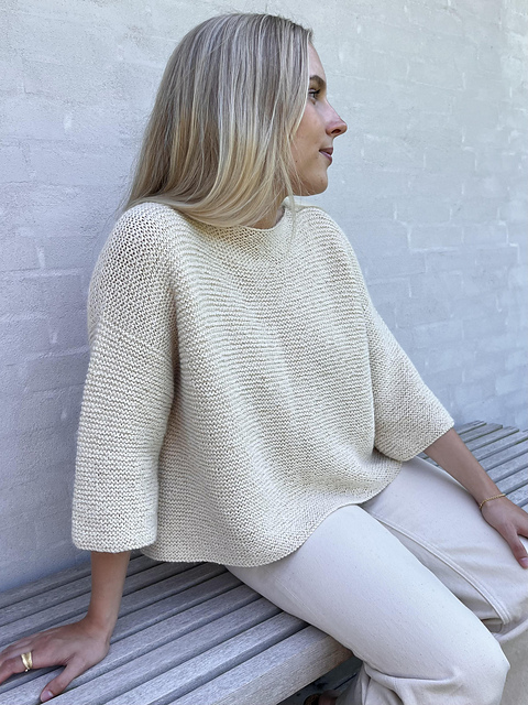 SIMPLY ME BLOUSE est pull court et oversize, simple et élégant, orné d’un joli pli creux au dos. Il présente une large encolure bateau, des manches ¾ et un point mousse épuré jusqu’aux bords.