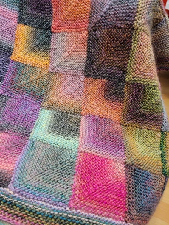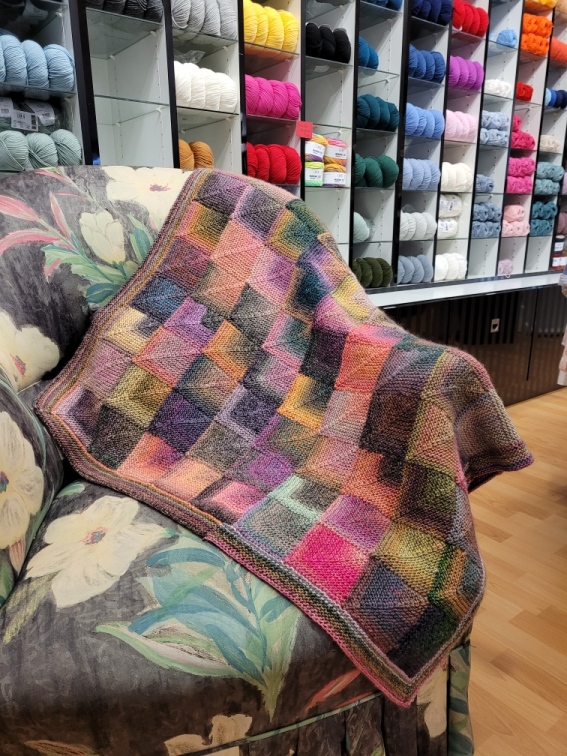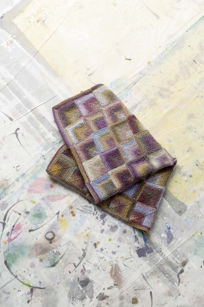 On peut également obtenir un rectangle en ajoutant des bandes de carrés, par exemple. Le modèle est déclinable à l’infini autant par la forme que par le choix des couleurs en laine Frida ou Viva de Lang Yarns.