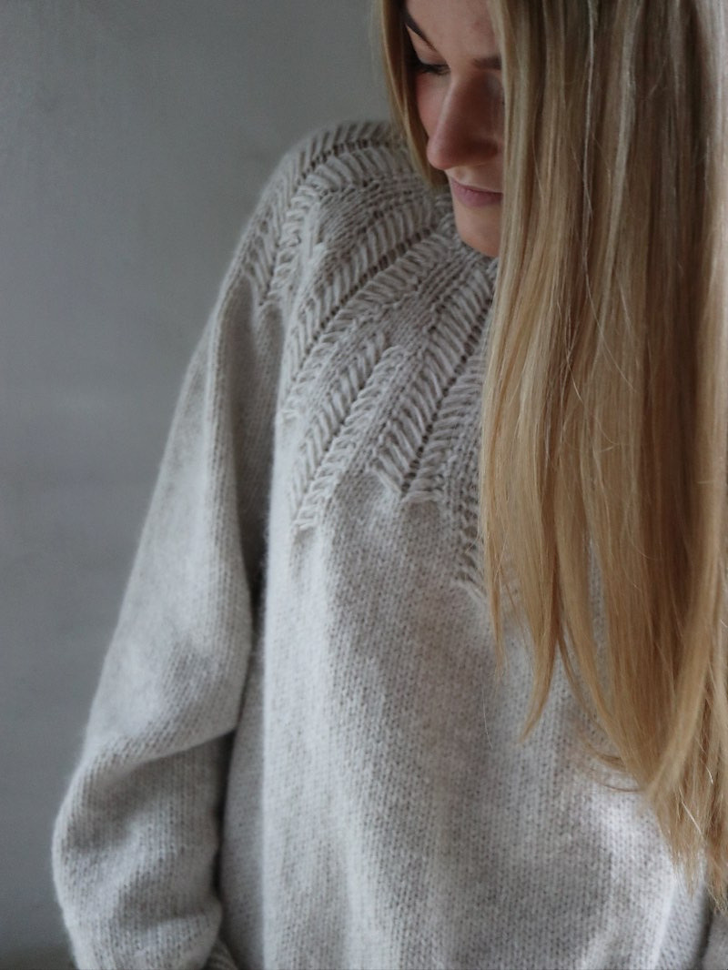 L’encolure est d’abord tricotée en côtes, puis repliée et tricotée ensemble, avant de continuer avec le point fantaisie sur l’ensemble de l’empiècement. Le corps est ensuite tricoté en jersey, puis terminé par un ourlet en côtes. Enfin, les manches sont tricotées avec des diminutions et finies par des poignets en côtes.